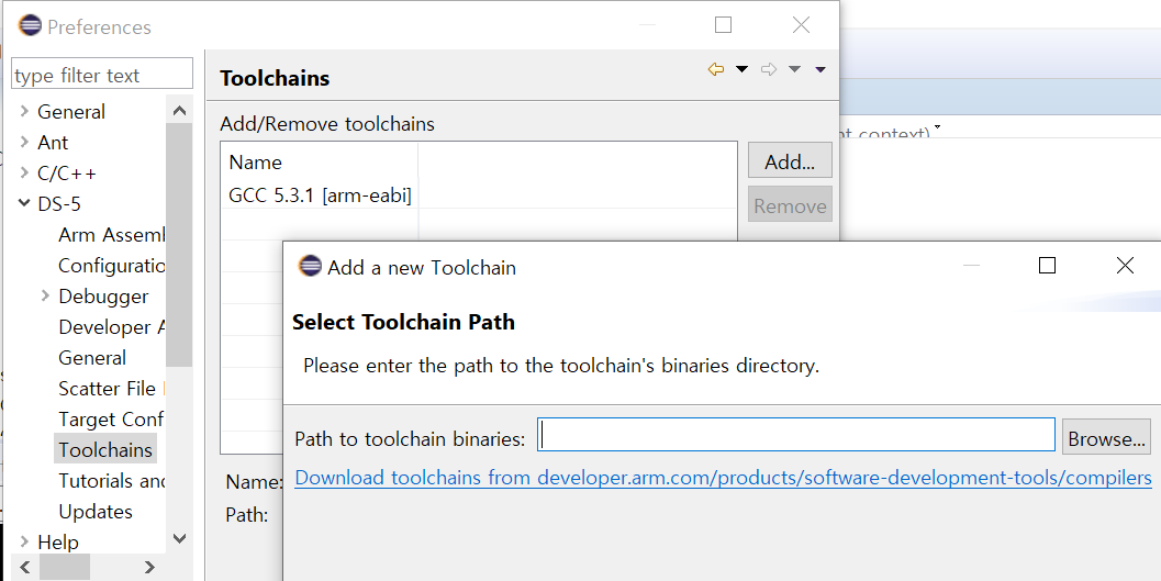 DS-5 밑에 Toolchains에서 Add를 눌러 Path에 압축을 푼 위치를 지정한다.