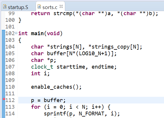 F5(step)나 F8(go)를 눌러 수행시키면, 더이상 프로그램이 진행되지 않는다.