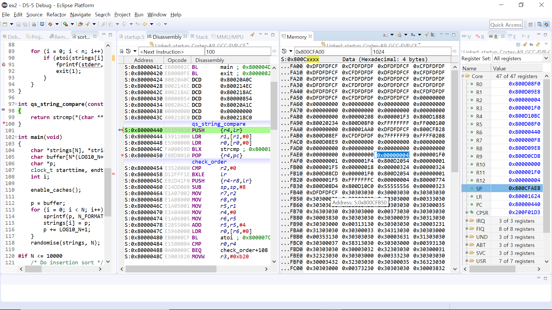 스택 포인터 값은 함수 진입 전의 위치, 0x800CFAE8로 돌아왔다(가장 우측 창의 노란색 부분).