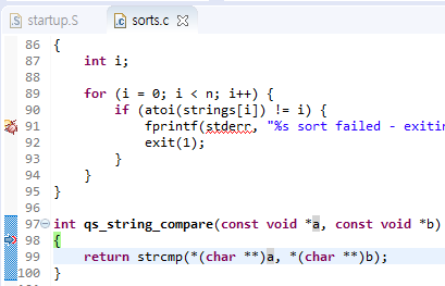 sorts.c 에 qs_string_compare 에 breakpoint를 잡는다.