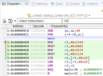 Disassembly 창에서 F5(step)으로 코드를 수행한다.